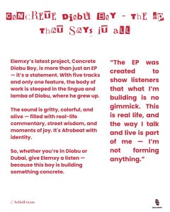 Elemxy’s latest project, Concrete Diobu Boy, is more than just an EP — it’s a statement. With five tracks and only one feature, the body of work is steeped in the lingua and lamba of Diobu, where he grew up.