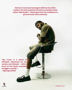 Elemxy’s music journey began while he was still a student. His early experiments led to a standout track called “Mamiwater”, which gave him the confidence to pursue music more seriously. Influenced by a wide range of artists such as Burna Boy, Black Magic, and Ajebutter22, Elemxy developed a unique ear and an even more unique voice — one that reflects the struggles, rhythm, and stories of everyday Nigerian life.