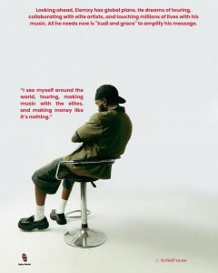 Looking ahead, Elemxy has global plans. He dreams of touring, collaborating with elite artists, and touching millions of lives with his music. All he needs now is “kudi and grace” to amplify his message.