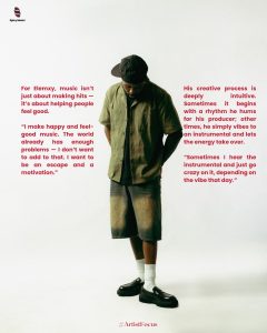 His creative process is deeply intuitive. Sometimes it begins with a rhythm he hums for his producer; other times, he simply vibes to an instrumental and lets the energy take over.