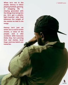 Elemxy isn’t just an artist; he’s a mirror of the streets, a voice of the people, and a vibe architect. With Concrete Diobu Boy, he’s proving that real stories, local lingo, and raw talent can travel far.