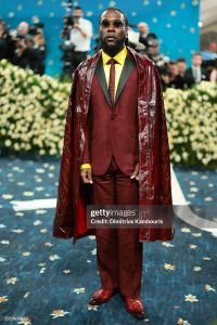 Burna Boy collaborated with British-Ghanaian designer Ozwald Boateng. He wore a regal red wool tuxedo paired with an oxblood eelskin cape, a design that deeply reflects Black excellence and Nigerian heritage. The cape symbolizes survival and cultural continuity from his Niger Delta roots.