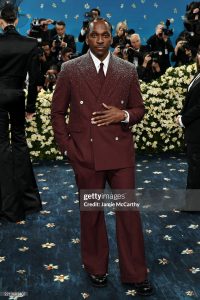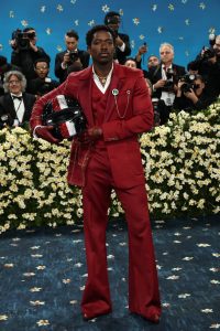 Brian Tyree Henry wore a custom ensemble by Orange Culture Nigeria, a Lagos-based fashion label known for its bold and expressive designs. His outfit featured an ornate red suit and coat, complemented by black leather gloves, boots, and David Yurman jewelry.