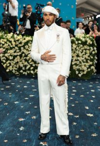 Lewis Hamilton stood out in a silk tailcoat adorned with embroidery, a brooch, beret, and shimmering buckled shoes by Manolo Blahnik, designed by Wales Bonner.