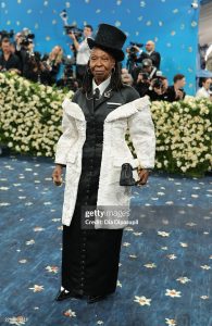 Whoopi Goldberg made a statement through an intricately detailed and historically inspired garment, though specific designer details are not mentioned in the available sources.