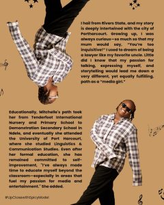 Educationally, Mitchelle’s path took her from Tenderfoot International Nursery and Primary School to Demonstration Secondary School in Ndele, and eventually she attended the University of Port Harcourt, where she studied Linguistics & Communication Studies. Even after her formal education, she has remained committed to self-improvement, “I’ve always made time to educate myself beyond the classroom—especially in areas that fuel my passion for media and entertainment.” She added.
