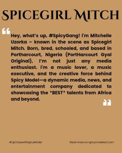 Hey, what’s up, #SpicyGang! I’m Nwanneka Mitchelle Uzorka known in the scene as Spicegirl Mitch. Born, bred, schooled, and based in Port Harcourt, Nigeria (Port Harcourt Gyal Original), I’m not just any media enthusiast. I’m a music lover, a music executive, and the creative force behind Spicy Model—a dynamic media, news, and entertainment company dedicated to showcasing the BEST talents from Africa and beyond.